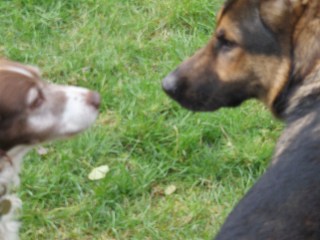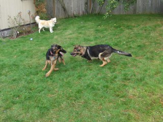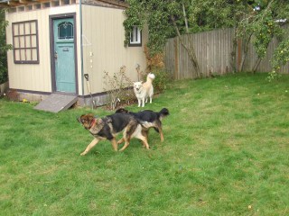 I introduced Pretty Girl first as she was the gentler of the two. She was a little timid of Loki and his exuberant ways. She is, however, a LOVESUCK for attention from people. She sticks to my hip when we wander around the backyard and she has commandeered the space under the desk so she can be right here for any petting I feel a need to do.