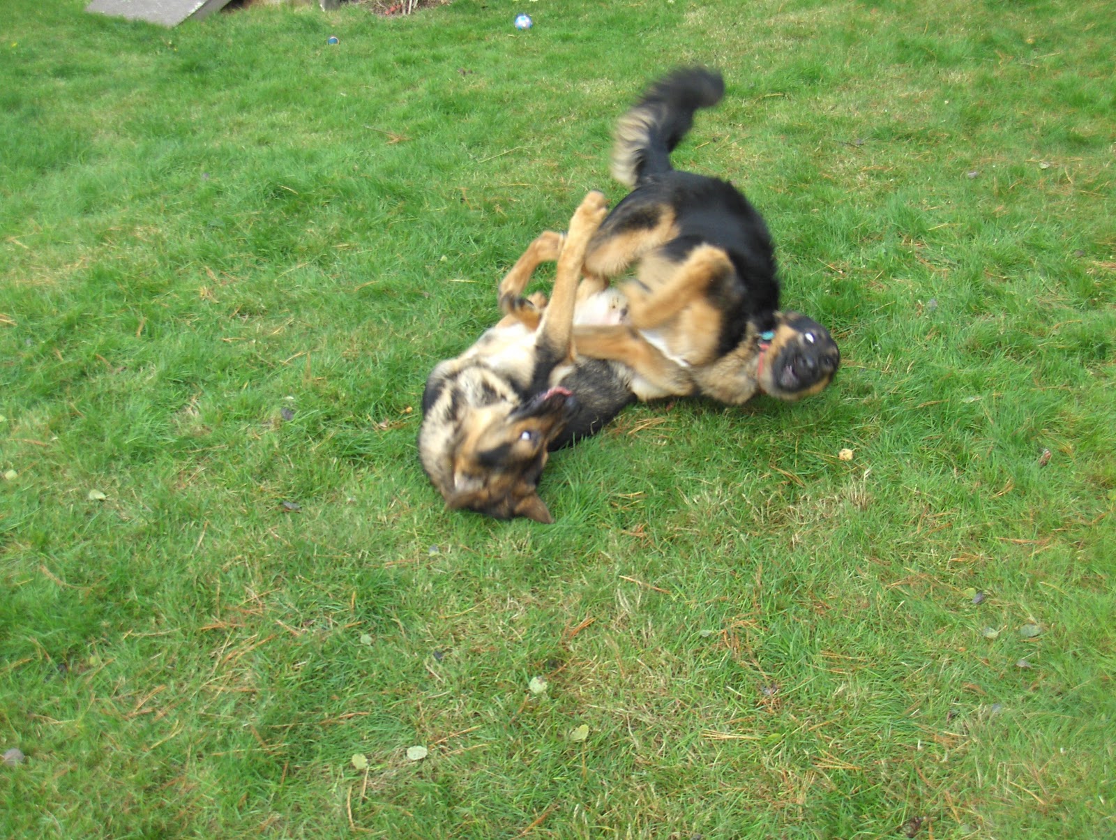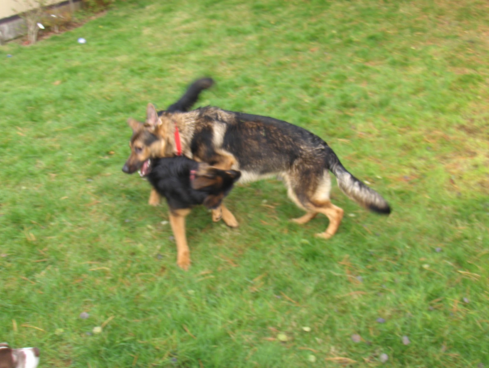 I introduced Pretty Girl first as she was the gentler of the two. She was a little timid of Loki and his exuberant ways. She is, however, a LOVESUCK for attention from people. She sticks to my hip when we wander around the backyard and she has commandeered the space under the desk so she can be right here for any petting I feel a need to do.