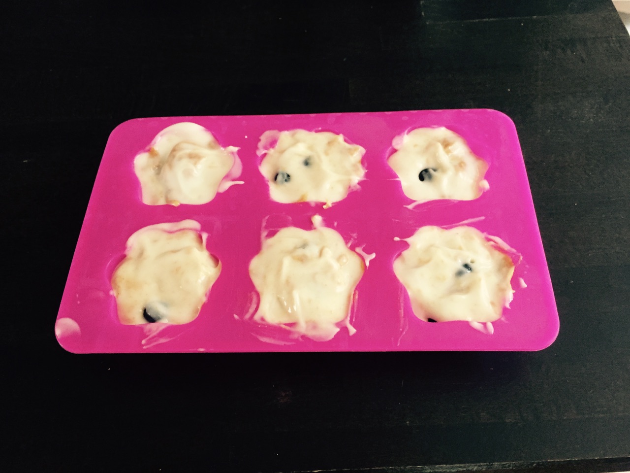 We start with yogurt, blueberries, a little chicken broth, and peanut butter.