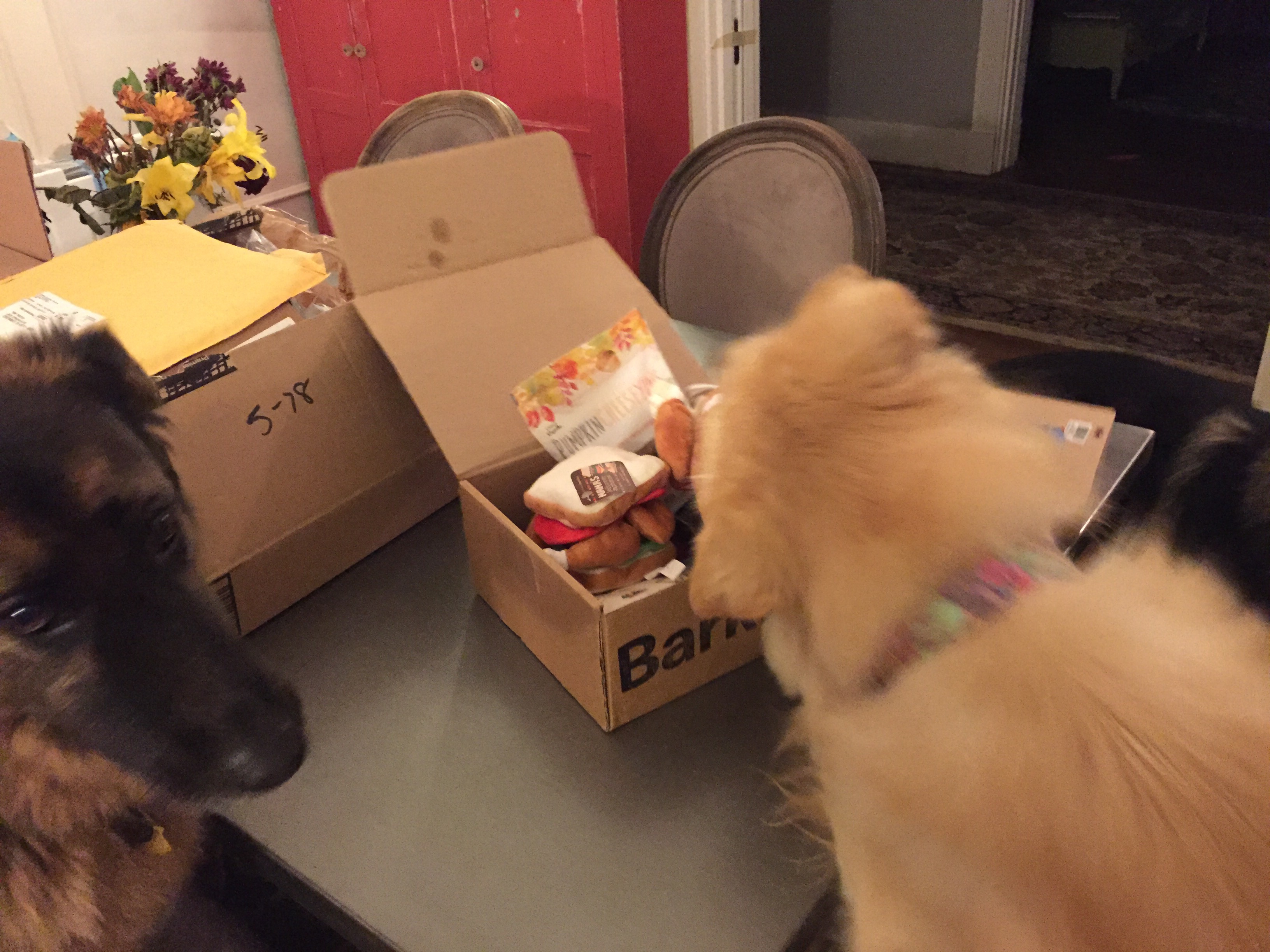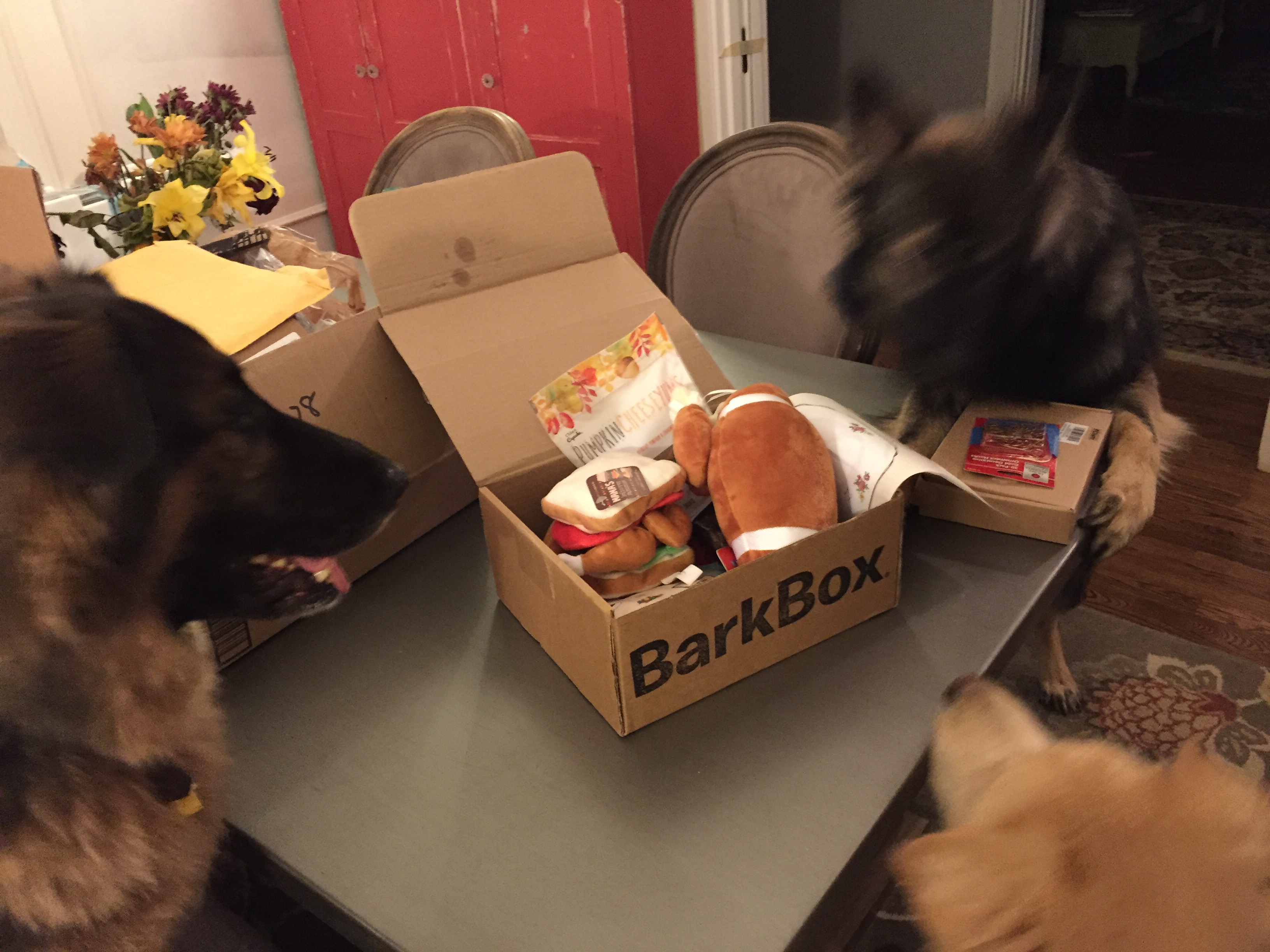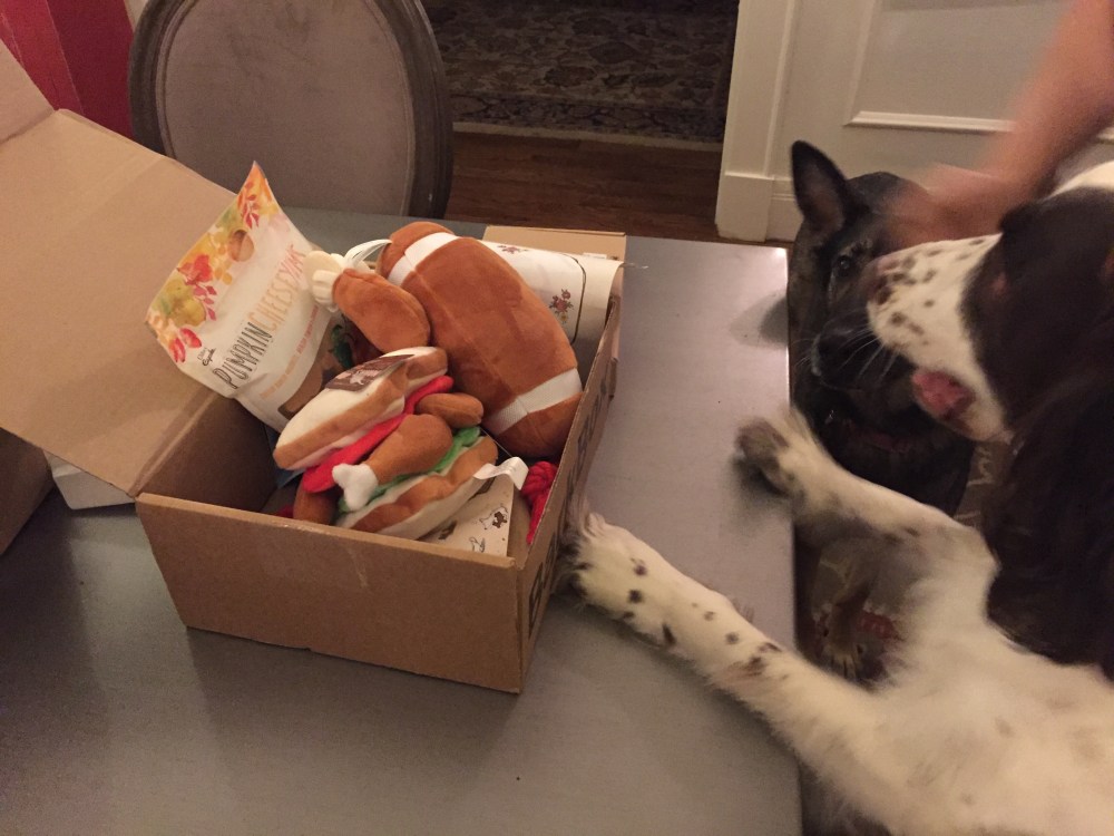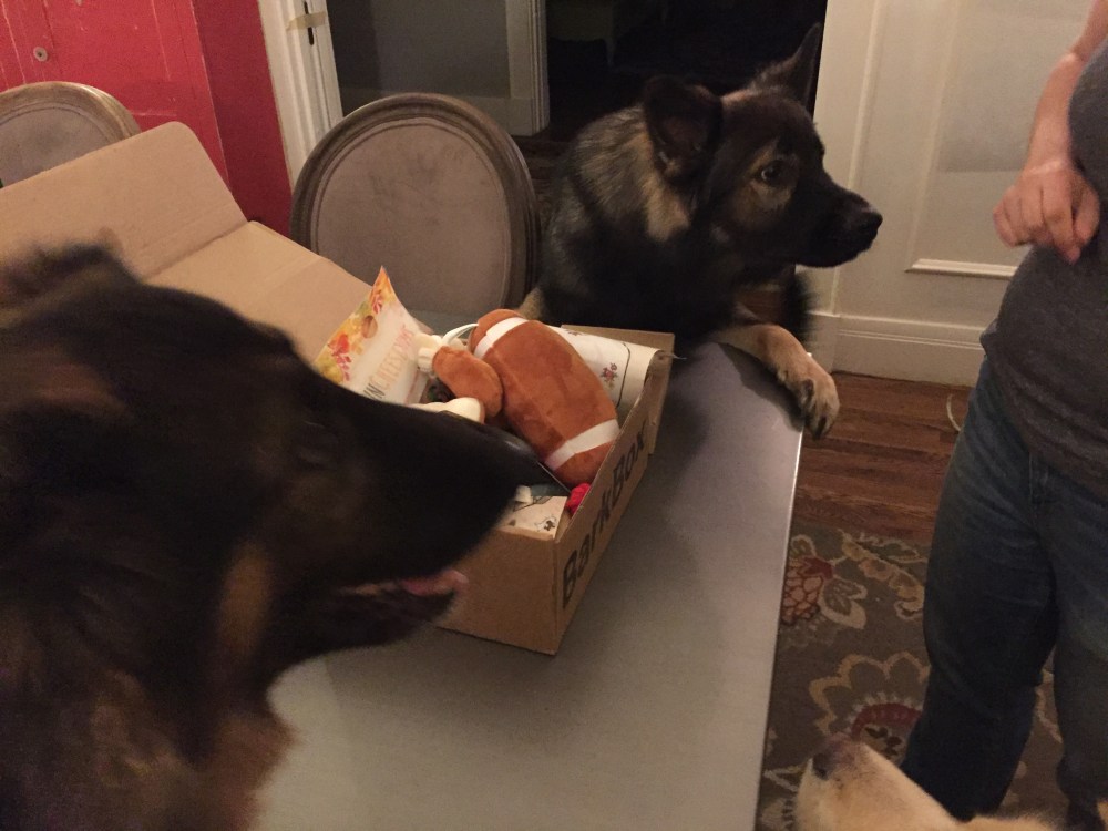 No words needed other than to say the Barkbox has arrived. Everyone is happy.