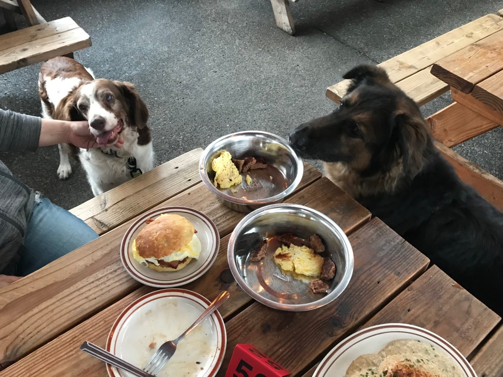 We started with breakfast. It is the most important meal of the day, after all. We went to the always popular, Pine State Biscuits. While dogs are not allowed inside the restaurant, this one, like many others, has a dog-friendly patio. It was a typical cool and damp Northwest morning, but the heaters had the covered patio nice and warm. Loki and Buddy settled in and we were set for a great start to our day. The pups got clean cooked scrambled eggs and split a sausage patty while I tucked in to a plate of biscuits and gravy.