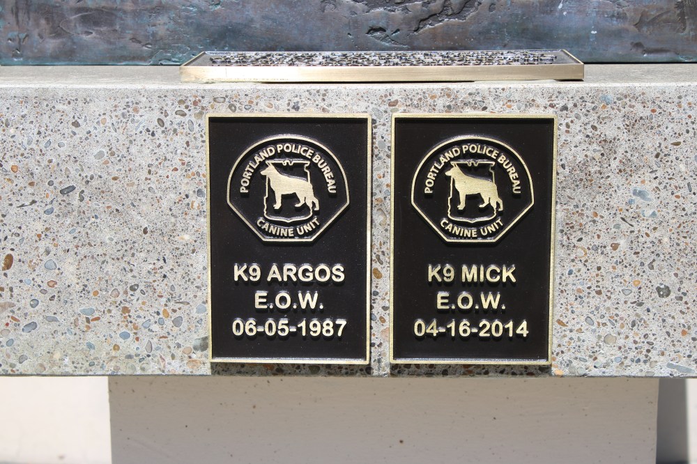Another name also adorns the memorial. K9 Argos was the first Portland canine officer killed in the line of duty. The 3-year-old German Shepherd had more than eighty apprehensions to his credit when he and handler Rod Lucich responded to a call of shots fired at a North Portland home back in 1987. When officers arrived, the gunman came out of the house shooting. Argos was hit and died enroute to an emergency clinic, exactly one year from his first capture, June 5, 1986.