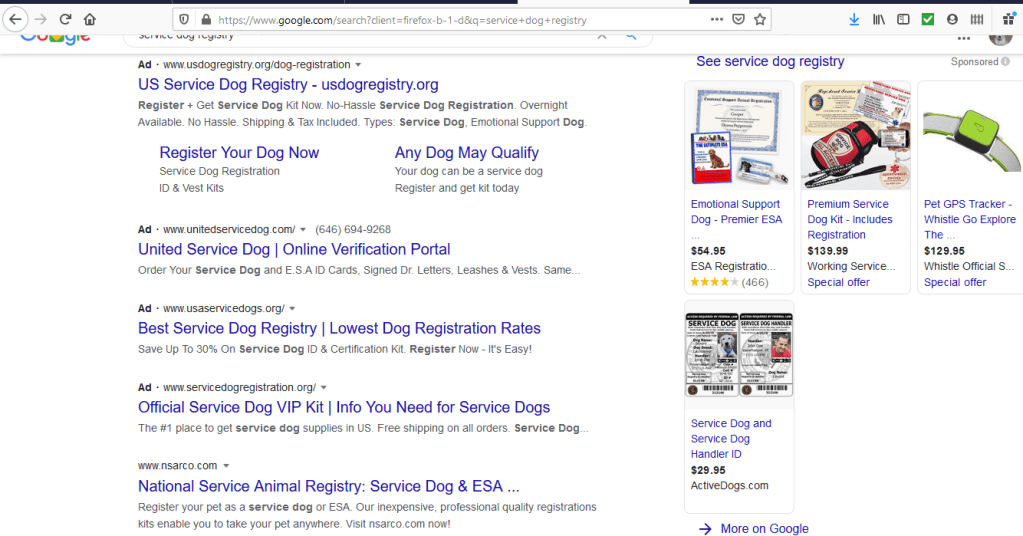 Now here is where some things start to get hazy. There is no formal training requirement, such as a specific protocol. There is no requirement for the dogs to wear any identifying attire such as a vest or ID tags, and there is no registry for service dogs. Let’s repeat that last item. There is NO REGISTRY for service dogs. Websites that offer registration and online certification of service dogs are fraudulent. Even if they send you some printed ID or a so-called service vest, this is all window dressing to cover up the fact that they are taking money for a service that simply is not necessary and does not exist. It is not just the companies that are participating in fraud. Many people, fully realizing their dog does not meet guidelines, or unwilling or able to get a real service dog, will pay the fees with the hope that people they encounter will be sufficiently impressed by the documentation not to question their legality. Some real service dog groups believe that having such documentation is a tell that the dog is not qualified because most real service dog users are familiar with the rules.