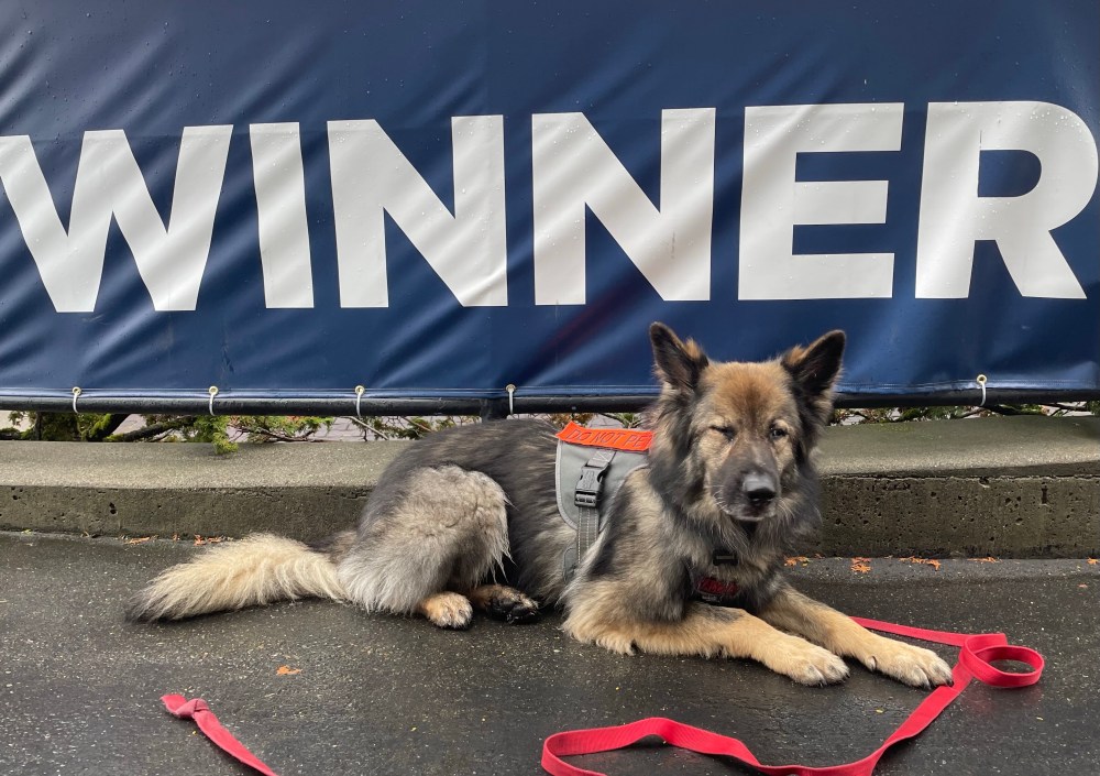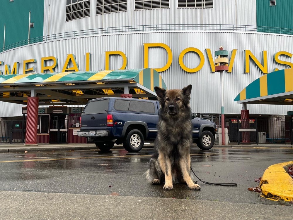 Our third challenge was the interior area search. The event was taking place at Emerald Downs Race Track. It is off season, so it was a large empty auditorium filled with stacks of chairs, tables and trash cans pushed to the side and an array of ephemera covered and waiting for next year’s racing to begin. As we waited for our turn to come Bacchus sat with his tug in his mouth. They called us to get ready. I took the tug and took a breath.