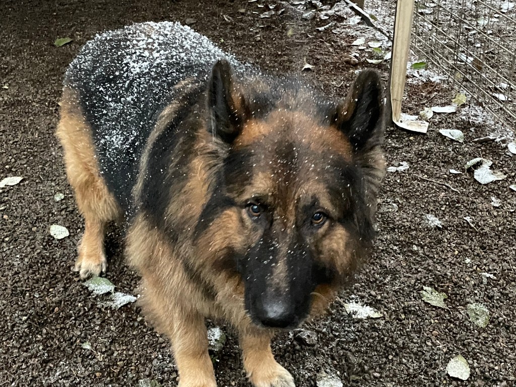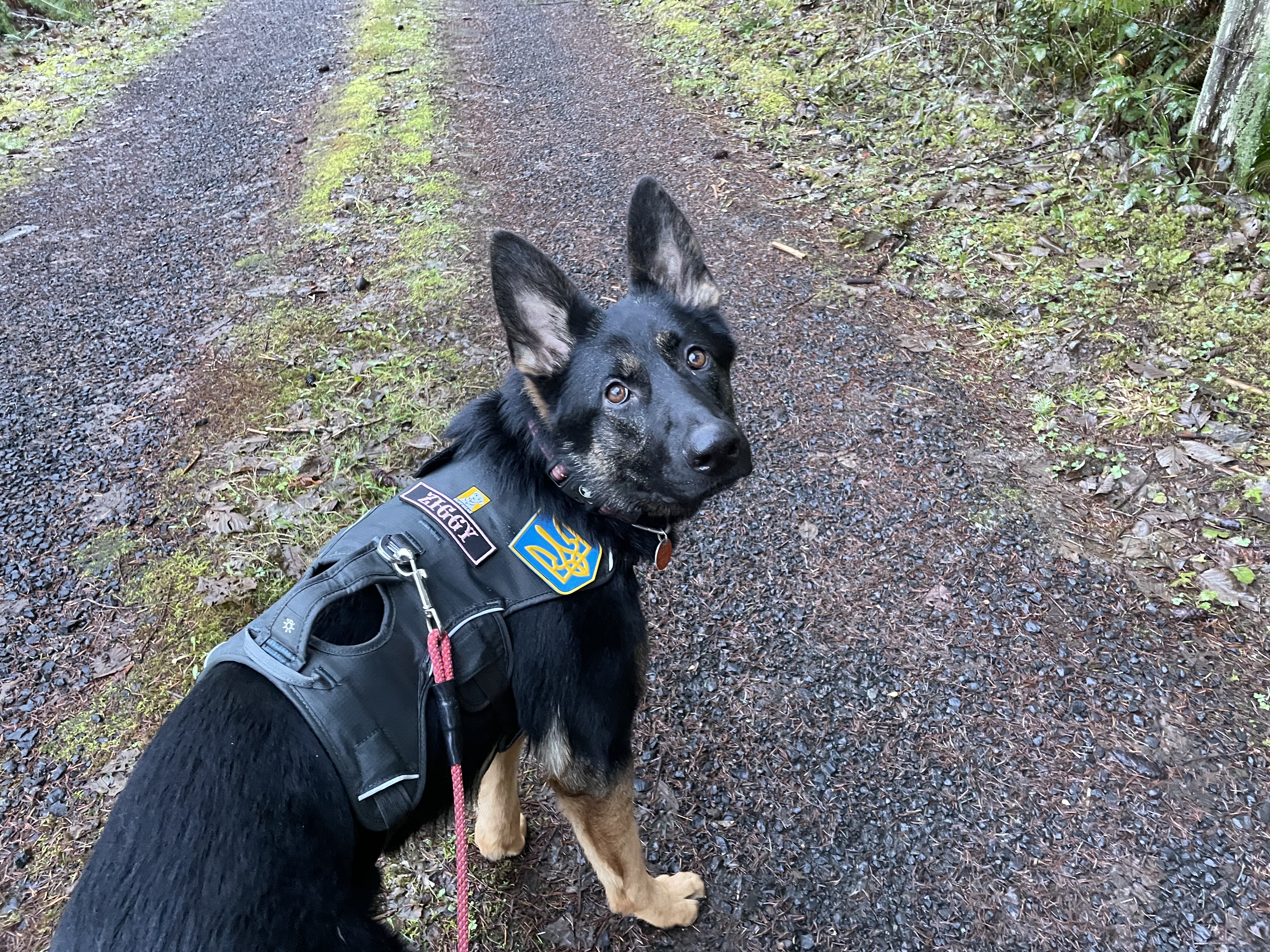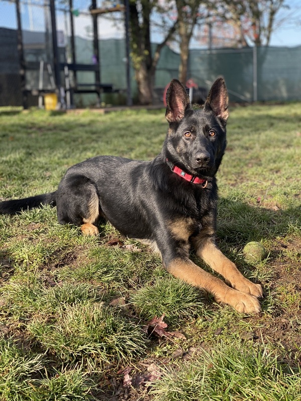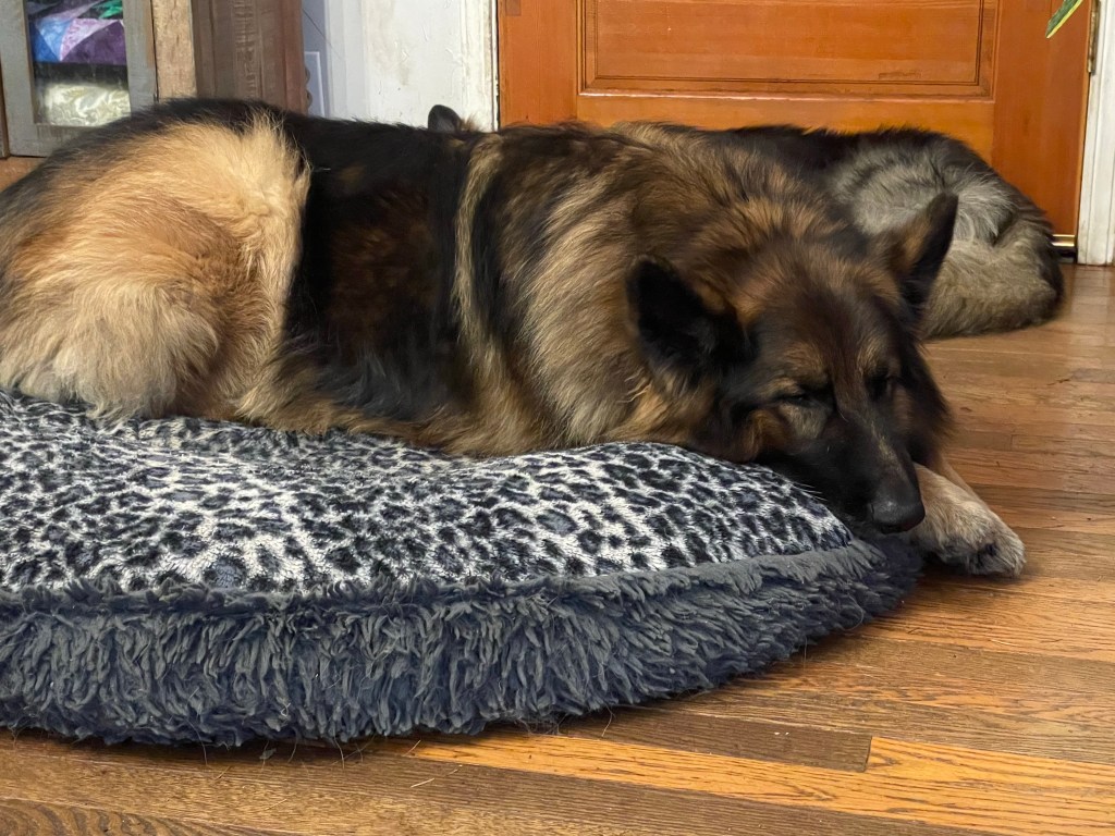 He had been living outside most of his life with another German Shepherd who was not very nice to him. A rescue near Kennewick, WA, took him in. They say his coat was in such dire shape the vet had to knock him out to cut all the mats and clean burrs out of his paws. They reached out to ODH to help place him as they were not having any interest in a 10-year-old GSD. Next thing I knew, he had moved in with us. He has turned out to be a great addition, if a bit bossy. He and Ziggy have been great together. I thought Zeus was ready for a life of long naps and slow walks, but with the new pup coming in, he has become very active. He plays with her every night, biting and thrashing like he’s a puppy himself.