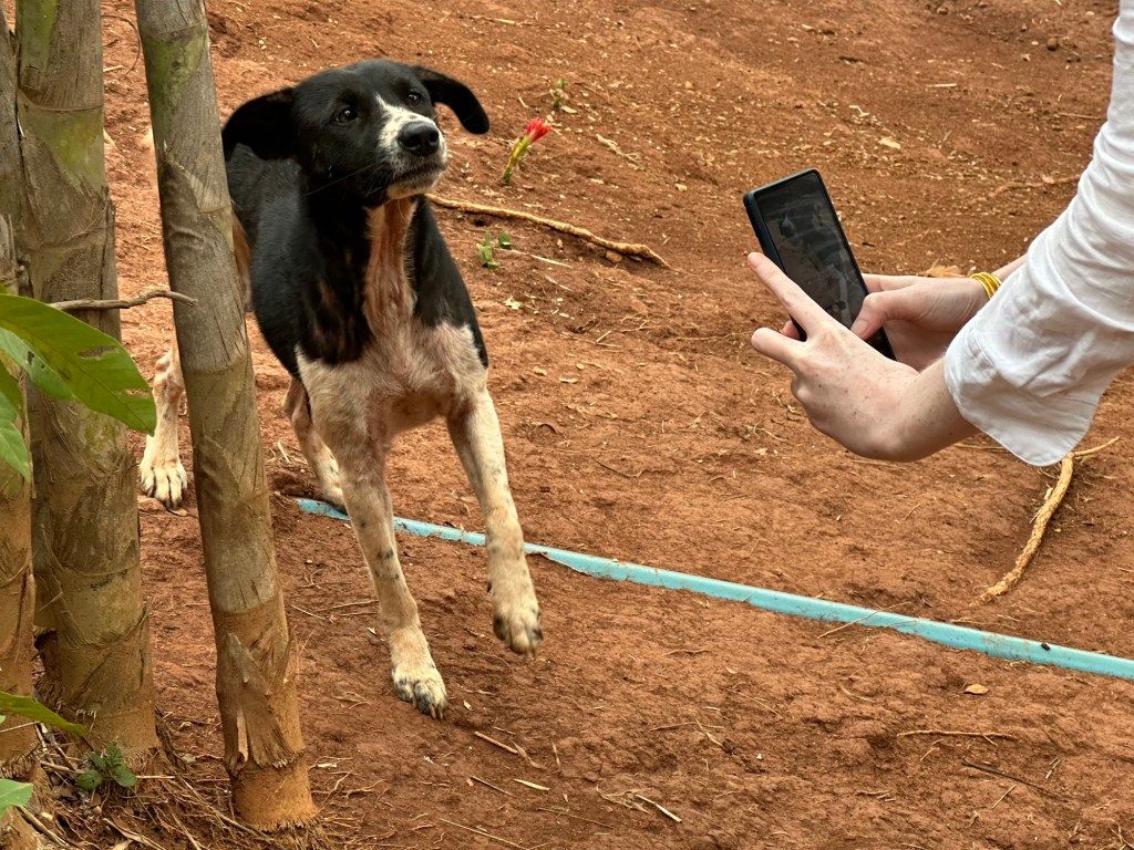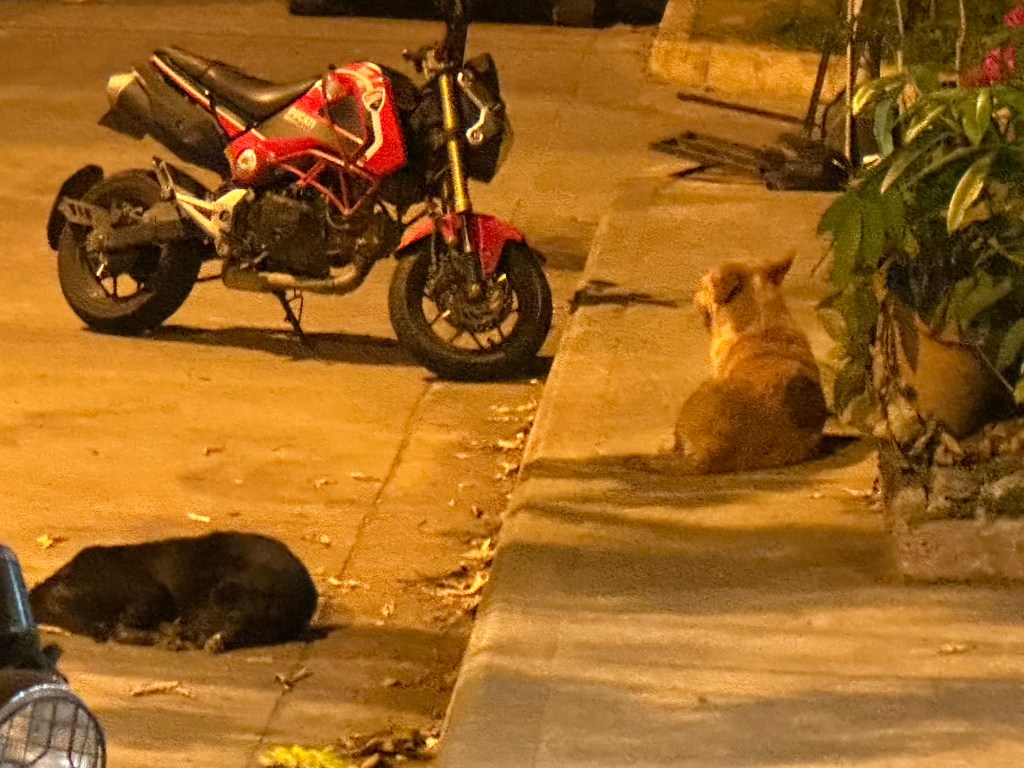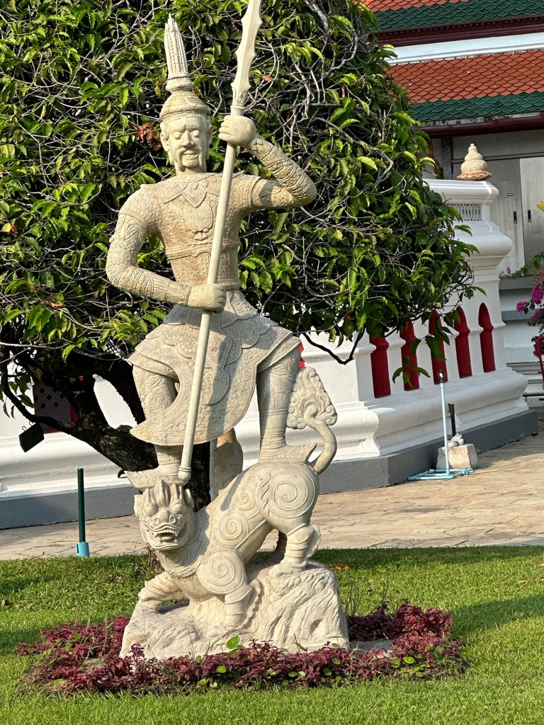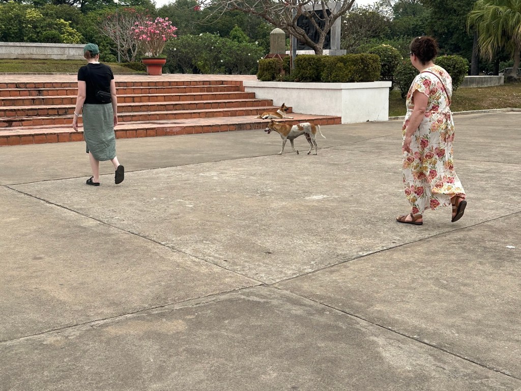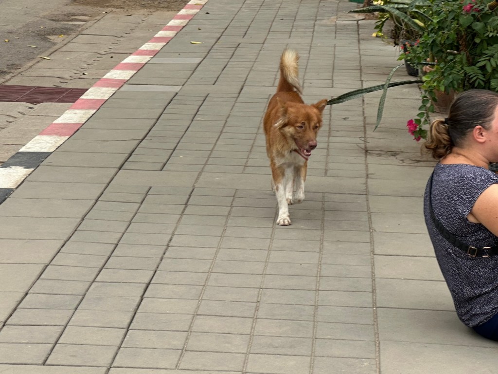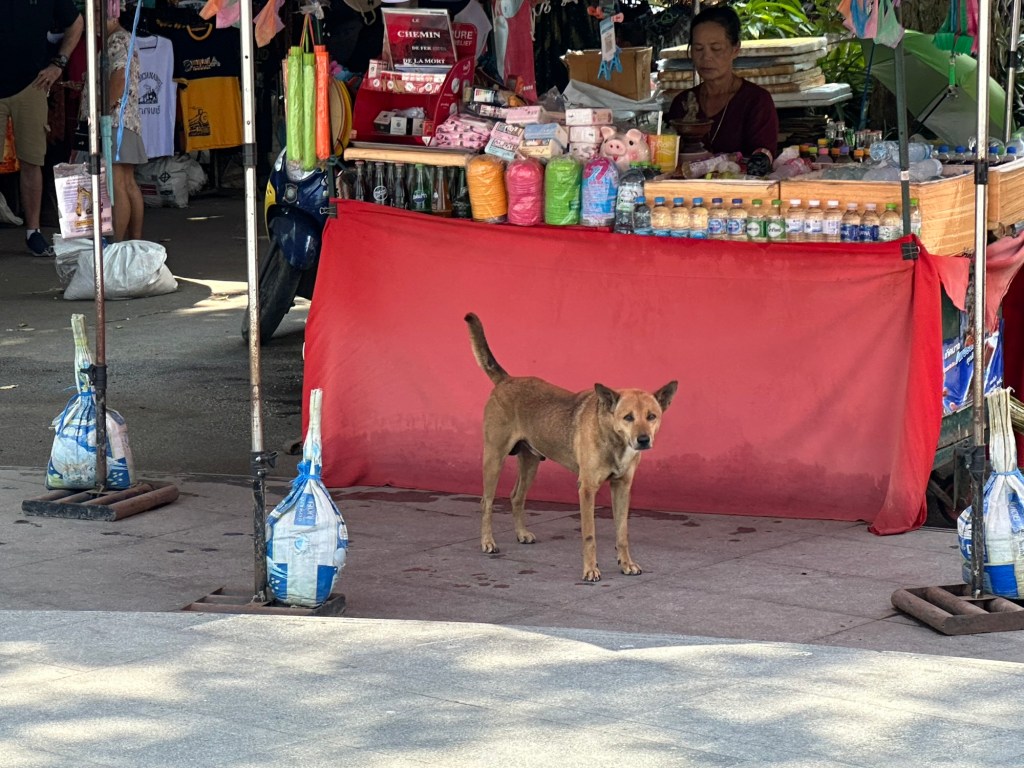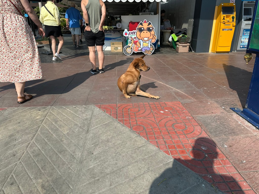 A day later though, we were headed to Thailand. We definitely saw a lot of dogs there. Unfortunately, very few were “owned” dogs. Most were street dogs, casually living their lives on the edges of society. Most people seemed to take little notice of the strays. Here and there, mostly in the tourist areas, we saw signs saying (in English) DO NOT FEED THE DOGS. We traveled from Bangkok north through several cities and a rustic village (which I felt was kind of a tourist trap) and the dogs were everywhere, including at least a couple in the artwork. I did note that there were far fewer in the old art than you see in European art. As you look at the pictures, there are several shots that look like the same dog. It is not. Each of these are different dogs, with the exception of two pictures of the dogs at the guard shack.