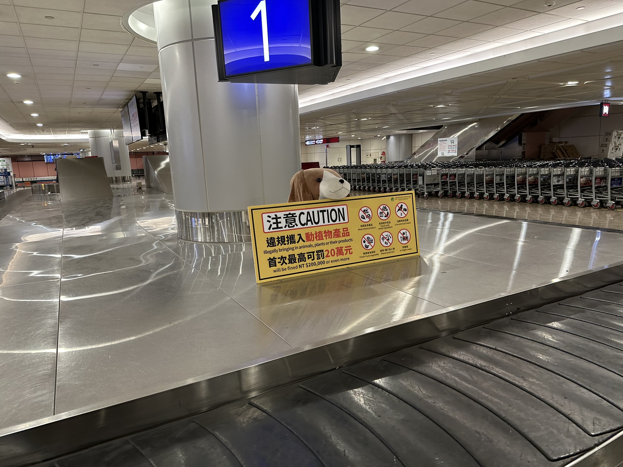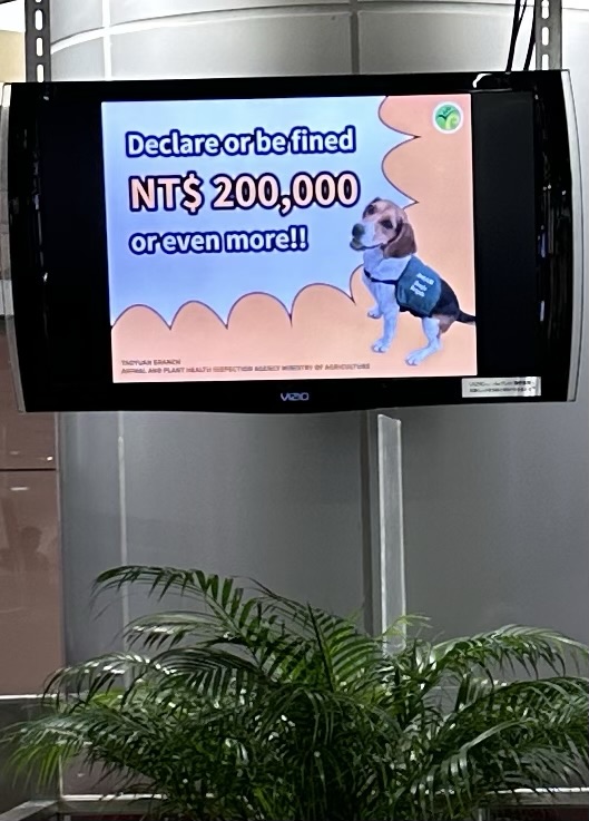 As always, I was on the lookout for information about how our canine companions live in countries other than our own. As soon as we got to Taiwan, there were dogs waiting for us. While there were none on duty when our late flight arrived, apparently detection dogs are a common fixture at the international terminal. I spotted several signs warning people that there were working dogs on site.