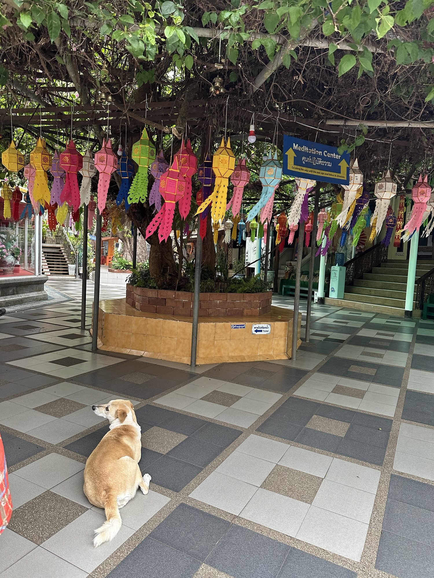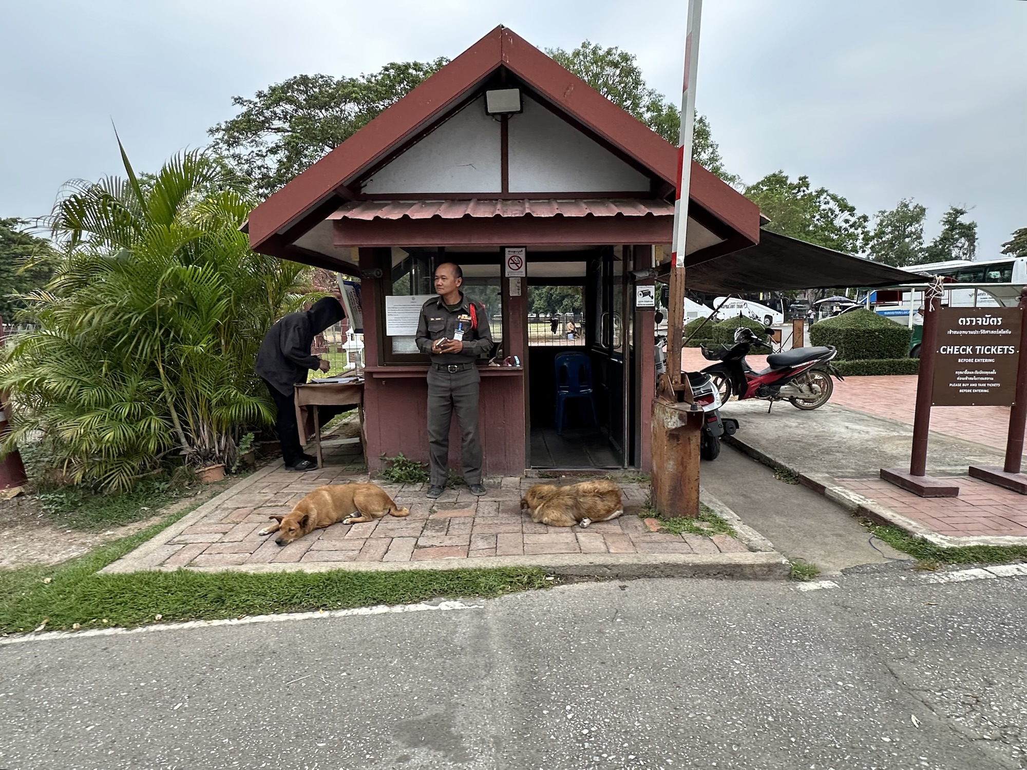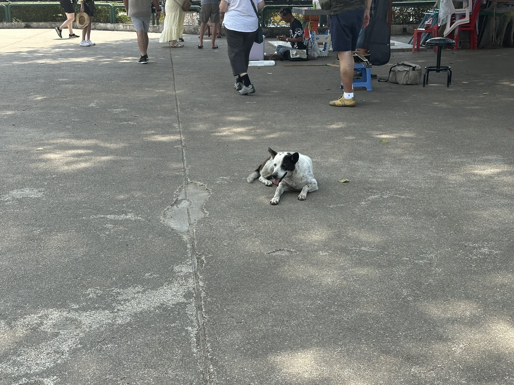 A day later though, we were headed to Thailand. We definitely saw a lot of dogs there. Unfortunately, very few were “owned” dogs. Most were street dogs, casually living their lives on the edges of society. Most people seemed to take little notice of the strays. Here and there, mostly in the tourist areas, we saw signs saying (in English) DO NOT FEED THE DOGS. We traveled from Bangkok north through several cities and a rustic village (which I felt was kind of a tourist trap) and the dogs were everywhere, including at least a couple in the artwork. I did note that there were far fewer in the old art than you see in European art. As you look at the pictures, there are several shots that look like the same dog. It is not. Each of these are different dogs, with the exception of two pictures of the dogs at the guard shack.
