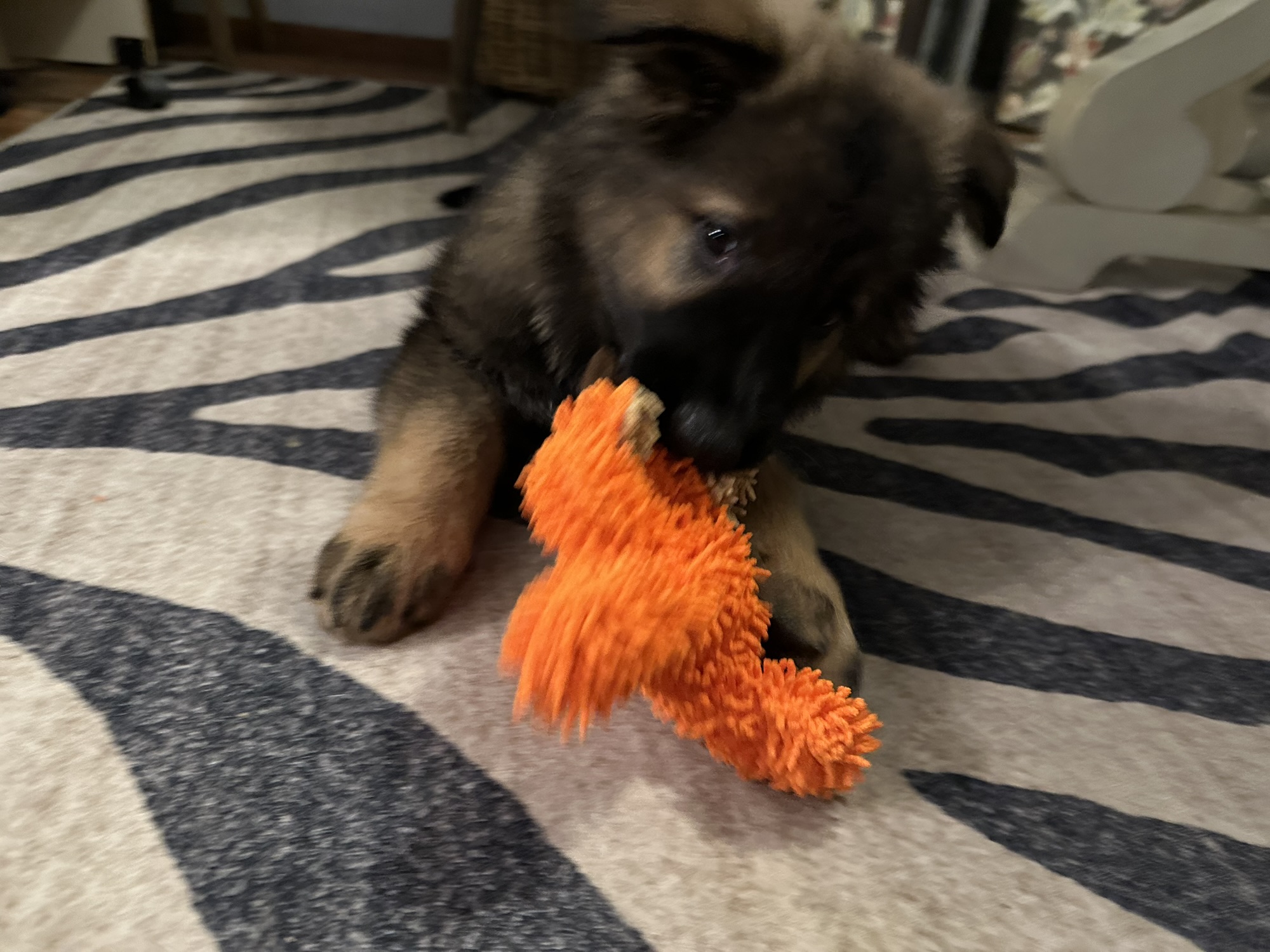 His official name is Basil von Kernholz on his AKC paperwork. Basil rhyming with razzle dazzle. I picked him up at 9 weeks old. He has been a handful! No matter how ready you think you are for a puppy, you’re not.