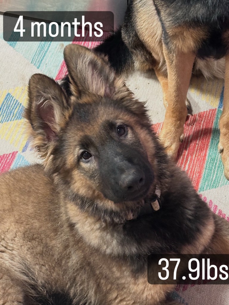 Basil weighed in at 39.7lbs. According to the Puppy Growth Calculator, that means by the time he is a fully grown GSD, he should be at about the 120 pound mark. I do not need a dog that big, so hopefully it is overestimating him.