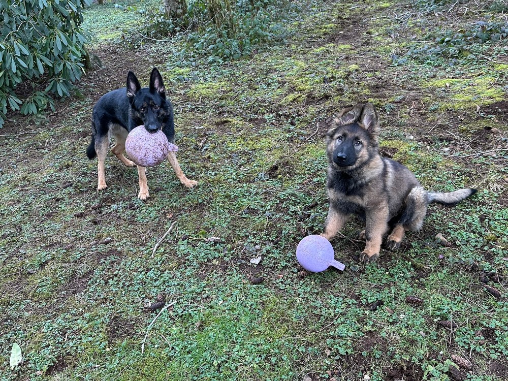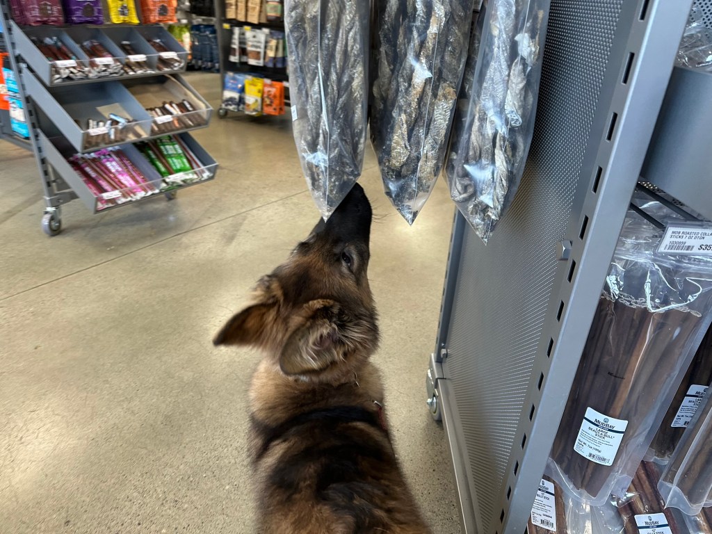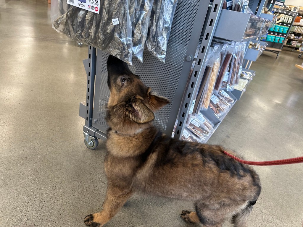 He is developing very well. He plays with Xiggy and harrasses Emma on a daily basis. I’ve taken him to a number of puppy safe places, including this visit to Mud Bay after the vet. He is very outgoing and resilient when something startles him.