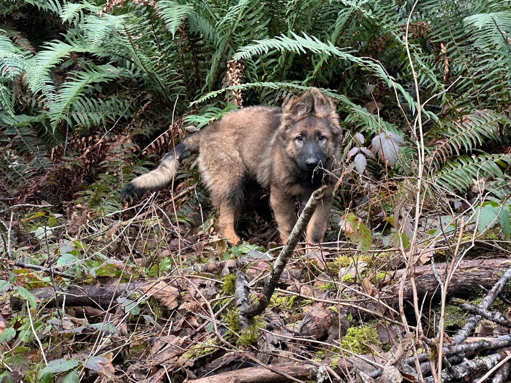 At home, he is quite the adventure dog. He runs wild through the ferns and wood piles in the yard.