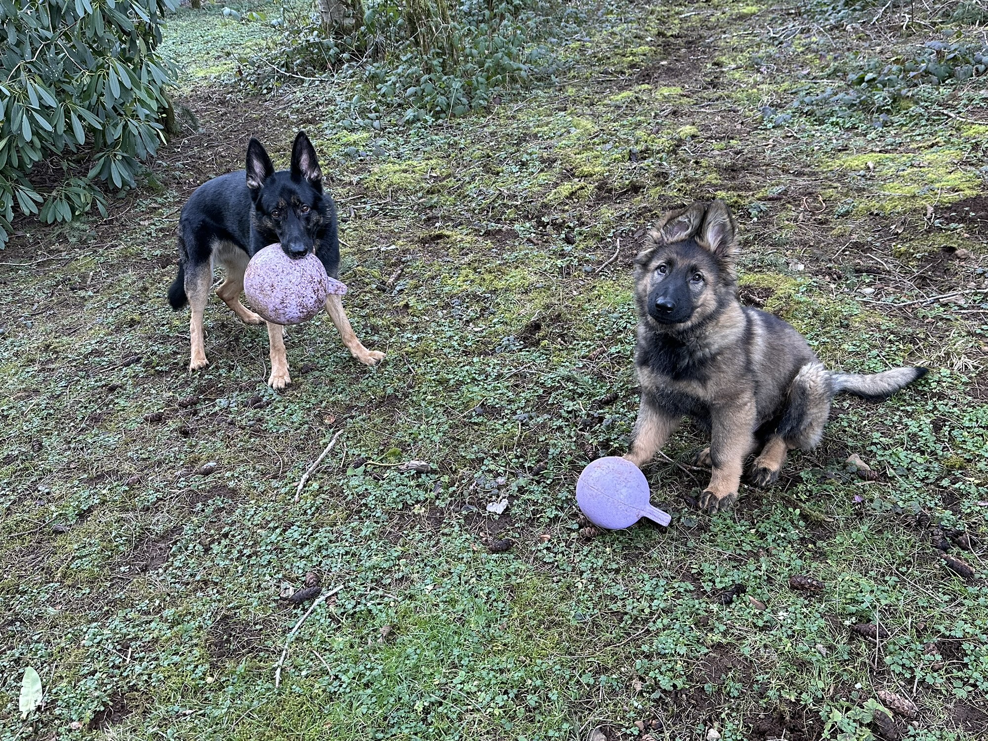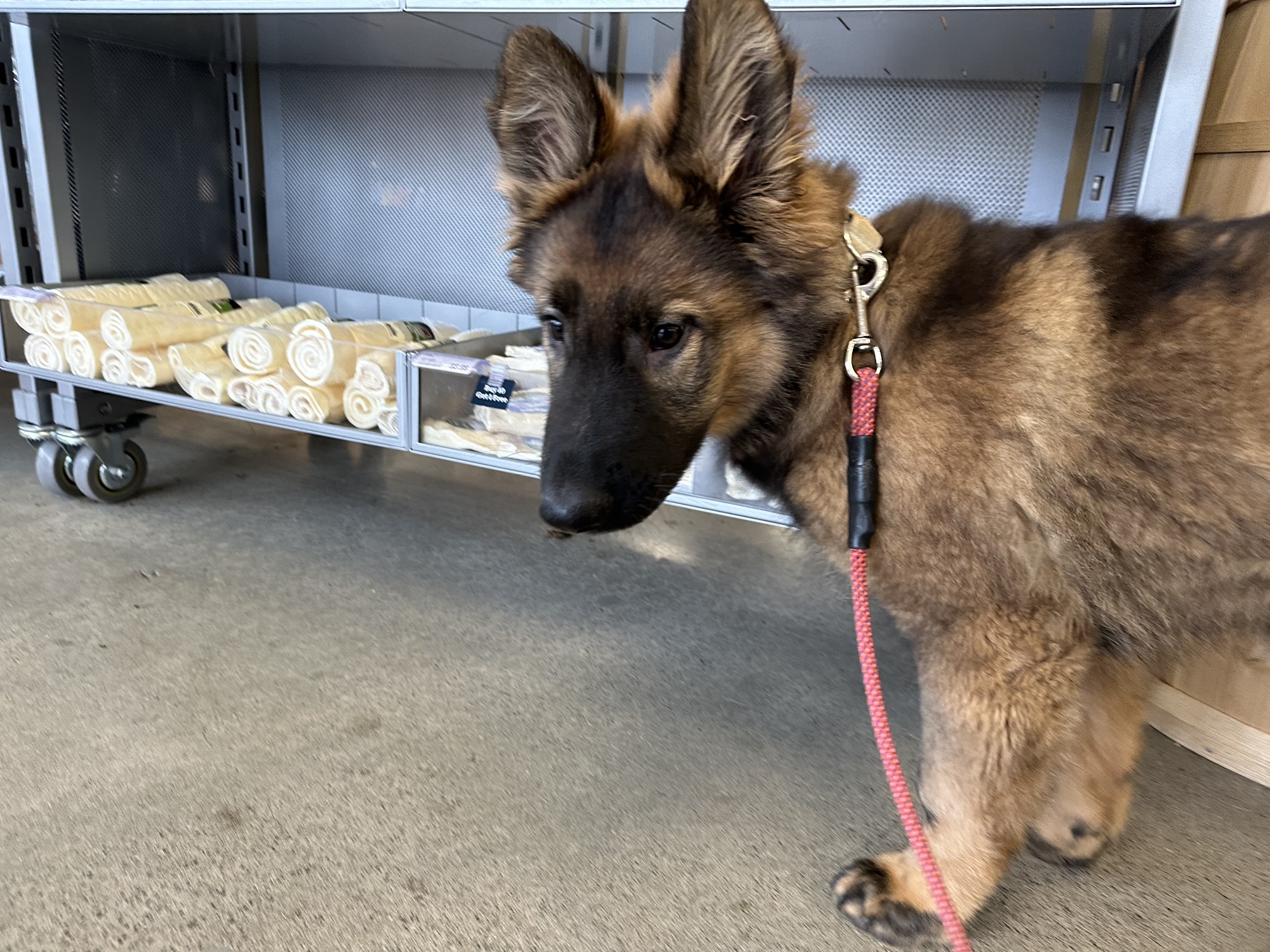 He is developing very well. He plays with Xiggy and harrasses Emma on a daily basis. I’ve taken him to a number of puppy safe places, including this visit to Mud Bay after the vet. He is very outgoing and resilient when something startles him.